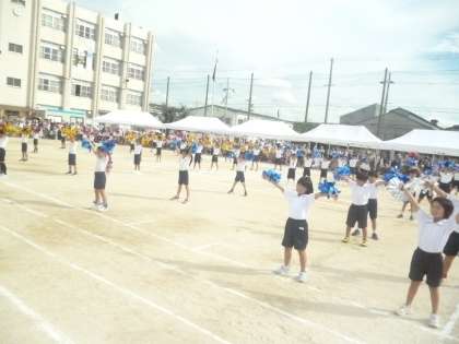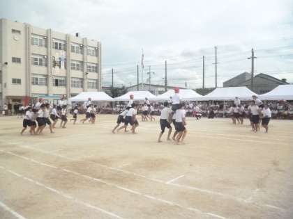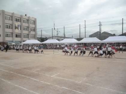 写真は、団体演技「アドベンチャー」(1・2年)、団体競技「騎馬戦〜鶴町頂上決戦〜」(6年)、団体競技「引っぱれ!引っぱれ!」(3年)の様子です。
