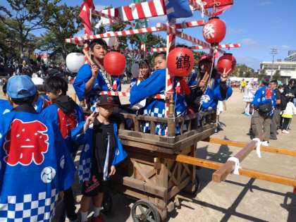 地域発表コーナーでは、神明神社のご協力により太鼓台車を出していただき、本校児童が台上で太鼓をたたいたり、地域の方々と台車を引っ張ったりしました。そして、地域・PTAの方々で鶴町地域の写真パネルを見せながら、鶴町のすばらしさを紹介していただきました。