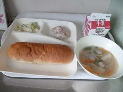 10月25日(金)の給食は、おさつパン・牛乳・かつおのガーリックマリネ焼き・ウインナーとジャガイモのスープ・キャベツのサラダです。