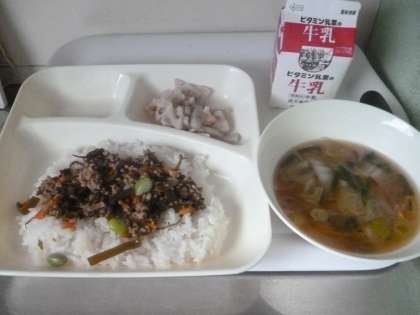 10月28日(月)の給食は、もずくと豚ひき肉のジューシー・牛乳・・サツマイモのみそ汁・焼きレンコンです。