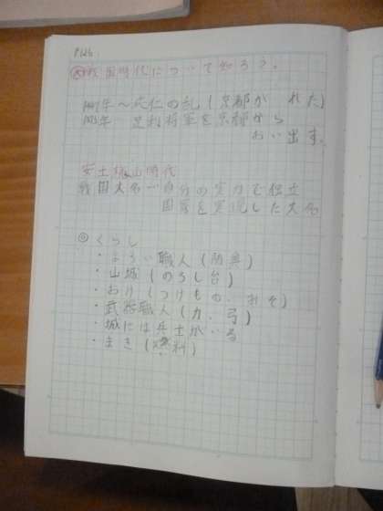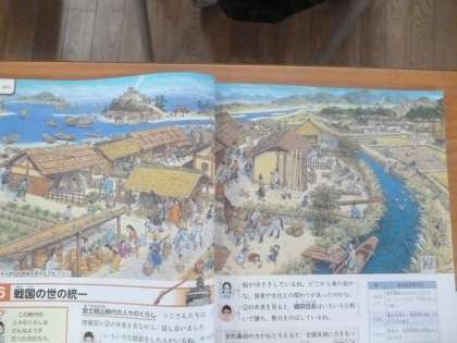 6年1組では社会科の時間に、戦国時代のくらしについて調べていました。教科書の挿絵をもとに、戦国時代のくらしの特徴と思われる箇所を探しました。見つけた部分をデジタル教科書上でクリックすると解説が出てくるので、調べたことを検証していました。