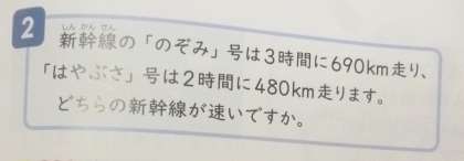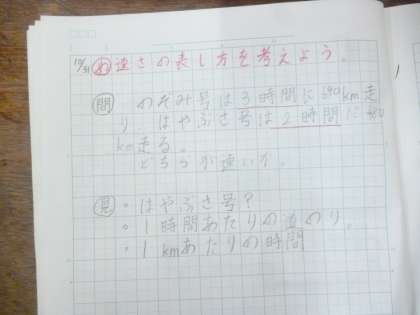 速さの表し方 公開日 2024/10/31 更新日 2024/10/31 5年 5年2組では算数科の時間に次のような問題に取り組んでいました。「のぞみ」号と「はやぶさ」号、どちらが早いかを考えます。「1時間当たりの道のり」と「1km当たりの時間」2つの見通しが出ました。どちらが早いかを比べるためには、どちらの方法がいいのか話し合っていました。 いいね(0)