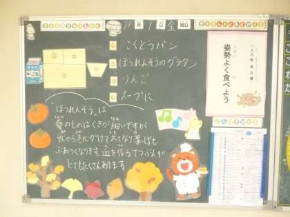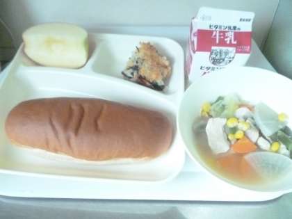 11月1日(金)の給食は、黒糖パン・牛乳・ホウレンソウのグラタン・スープ煮・りんごです。