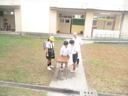 登校する何人かの児童が挑戦しましたが、水までなかなか上手に振動が伝わりません。米谷先生によると、朝の時間に成功したのは2人だけだったそうです。
