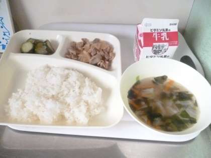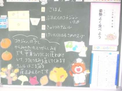 11月5日(火)の給食は、ごはん・牛乳・豚肉のコチュジャン炒め・鶏肉と春雨のスープ・きゅうりのナムルです。