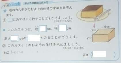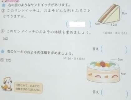 およその体積 公開日 2024/11/07 更新日 2024/11/07 6年 6年1組では算数科の時間に次のような問題に取り組んでいました。カステラの体積は、全体を立方体ととらえると「3×4×6」が式になるようです。ただし、カステラは正確な直方体ではないので、答えに「約」を必ずつけてほしいです。 次のサンドイッチの問題も、三角柱に見立てて計算します。ここでも忘れてはいけないのが答えに「約」をつけることです。 いいね(0)