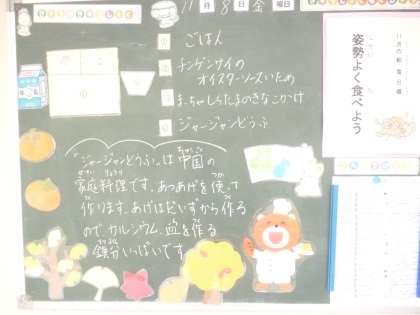 11月8日(金)の給食は、ごはん・牛乳・ジャージャン豆腐・チンゲンサイのオイスターソース和え・抹茶白玉のきな粉がけです。令和5年度学校給食献立コンクール最優秀賞の献立です。