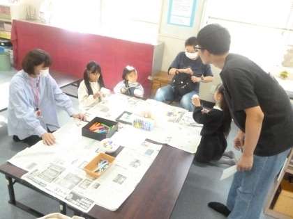 放課後いきいき活動教室の方々が「ワークショップ」のお店を出してくださいました。紙コップを使って楽しい工作をしていました。