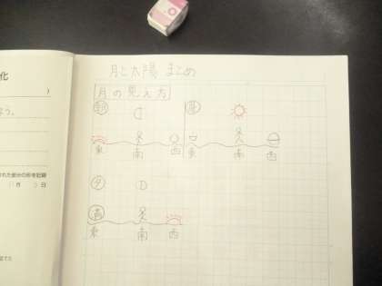 6年1組では理科の時間に「月と太陽」のまとめをしていました。月がどのような形に見えるかは、地球と月と太陽の三者の位置関係で決まることをノートにまとめていました。月がいつどんな形になるのかを覚える必要はないですが、原理は知っておいてほしいと思います。