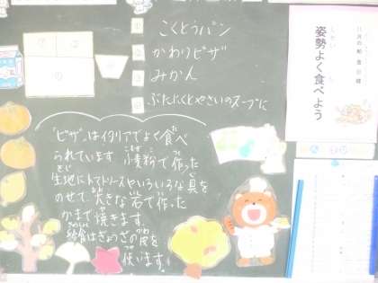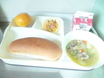 11月14日(木)の給食は、黒糖パン・牛乳・豚肉と野菜のスープ・変わりピザ・みかんです。