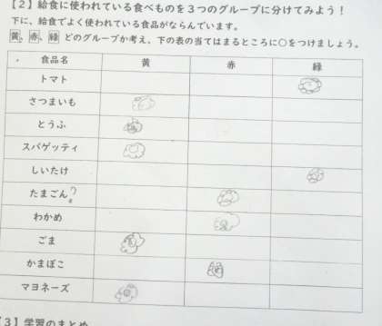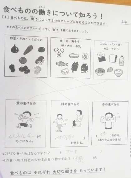 食べもののはたらきを知ろう 公開日 2024/11/14 更新日 2024/11/14 4年 4年2組では食に関する指導「食べ物のはたらきを知ろう」に取り組んでいました。栄養3色のはたらきについて思い出した後、給食の献立表をもとに、使われている食材が3つのグループに分けてみました。給食では、3色の栄養素がバランスよく含まれていることがわかったようです。 最後に、自分たちの食生活について栄養バランス面で振り返ってみました。 いいね(0)