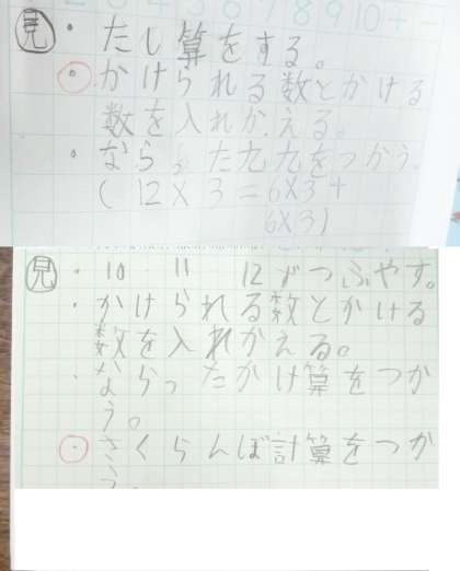 九九の表を広げよう 公開日 2024/11/20 更新日 2024/11/20 2年 2年1組では算数科の時間に、9の段まである九九の表に「10の段」「11の段」……とランを増やしていきます。かけ算のけたが大きくなっていくことに対して、子どもたちからは、「かけられる和人×数を入れ替える。」「式を分解し得、習った九九を使う。」などの見通しが出されました。では、九九の表を広げる作業、スタートです。 いいね(0)