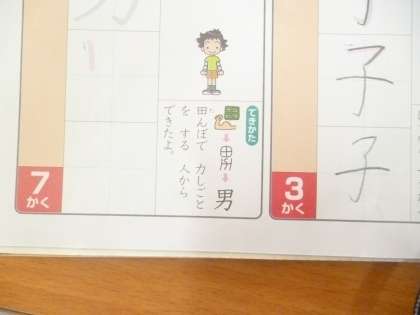 1年生は国語科の時間に、新出漢字「男」「年」を習っていました。「男」は「田」と「力」が組み合わさっていて、漢字の起源に関わっていることがわかりました。では、練習をします。先生から「男」と「力」の大きさに気をつけること、1から4の部屋を意識して書く説明を受けました。