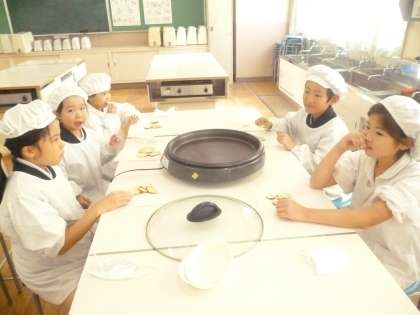 最初の1枚は、そのまま食べました。サツマイモ本来の甘味を味わえたでしょうか。2枚目からは、好みで塩をかけてもいいようです。美味しかったようで、みんなニコニコ笑顔で食べていました。