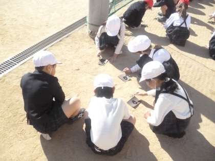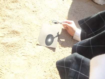 3年生は理科「かげと太陽」を学習しています。本時では、虫眼鏡で日光を黒い紙上の一点に集めるとどうなるのかを実験していました。時間が経つにつれて、黒い紙に穴が開いてきたり、煙が上がってきたり、黒い紙に、いったいどんな変化が起こっているのでしょうか。