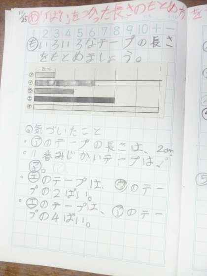 2年 「倍」を使った長さの求め方 公開日 2024/11/25 更新日 2024/11/25 2年 2年1組では算数科の時間に、「倍」を使った長さの求め方を学習していました。倍の関係について、子どもたちはいろいろ気づいていました。(ア)のテープはいちばん短くて「2cm」、(イ)は(ア)の3倍、(エ)は(ウ)の3倍・・・。 では、式を立てて(イ)から(エ)のテープの長さを求めましょう。 いいね(0)