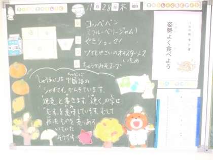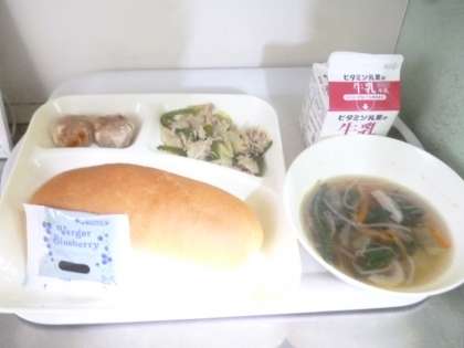 11月28日(木)の給食は、コッペパン・ブルーベリージャム・牛乳・焼きシュウマイ・中華味噌スープ・ツナと野菜のオイスター炒めです。