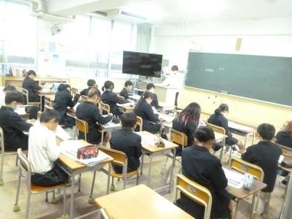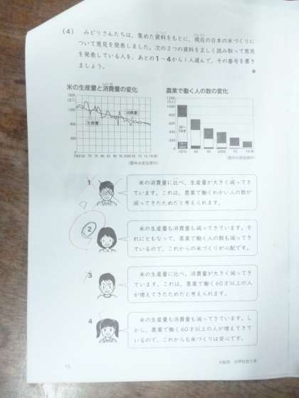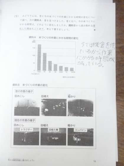 5年2組では社会科の時間に復習のプリントに取り組んでいました。農業の問題を答え合わせしていました。米の生産量と消費量の変化、農業で働く人の数の変化、この2つの資料を見て正しい意見を4択します。資料を正確に分析したり、意見文を読み取ったりする力が必要ですが、みんな集中してがんばっていました。