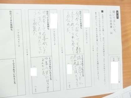 4年 聞いてほしいな。こんな出来事 公開日 2024/11/29 更新日 2024/11/29 4年 4年1組では国語科「聞いてほしいな。こんな出来事」を学習しました。その後、自分でも友だちに聞いてほしい話を原稿用紙にまとめました。一人ずつ前に出てスピーチし、聞いた人は、「伝わってきたこと」「工夫しているところ」をワークシートに書き込んでいました。 いいね(0)