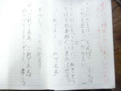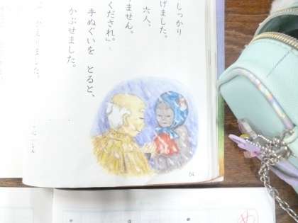 2年1組では国語科「かさこじぞう」第3場面、かさこが売れず、とんぼりとんぼり帰る「じさま」の前にじぞうさまが・・・。じぞうさまにかさこを被せ「これでええ。これでええ。」と言う「じさま」の思いを考えていました。