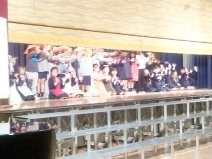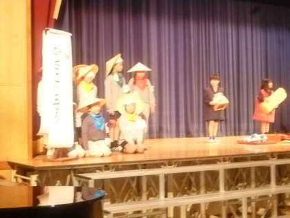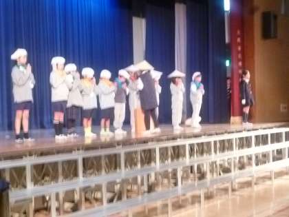 学習発表会4 公開日 2024/11/30 更新日 2024/11/30 2年 休憩をはさんで、後半は2年生「かさこじぞう」から始まりました。国語科の授業で登場人物の気もちや様子を読み取っていました。登場人物のナレーターも、それぞれが工夫して台詞を表現しようとがんばっていました。 いいね(0)