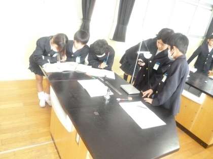 5年生は理科「ふりこのきまり」を学習しています。本時では、おもりの重さとふりこの長さを同じにして、ふり幅の角度を変えた時に、おもりが往復する時間はどうなるか実験していました。ふりこを振る係、ストップウォッチで往復する時間を測る係、ノートに時間を記録する係など、班で分担を決めて協力していました。