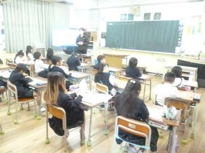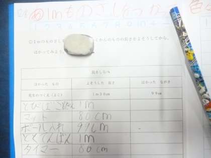 2年 1mのものさし 公開日 2024/12/06 更新日 2024/12/06 2年 2年1組では算数科の時間に、体育館にあるいろいろな物に長さを1mで測ります。「とびばこ〇段」「マット」「ゴール入れのかご」など、体育館にある思いついた物を表に書いていました。「点数を入れる『あれ』、何だったかなあ。」「それは得点板だ。」など会話が飛び交いました。 この後、体育館に移動して長さを測ります。 いいね(0)