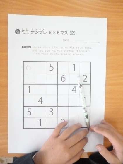 1年 算数パズル 公開日 2024/12/12 更新日 2024/12/12 1年 1年生は算数科の時間に算数パズルを解いていました。縦6マス横6マス計36マスで、縦横全ての列、そして、縦2列横3列の長方形6マス内にも、1〜6までひとつずつ入るように数字を入れていきます。 1から6までの数字はおなじみになりましたが、このパズルは手ごわそうでした。 いいね(0)