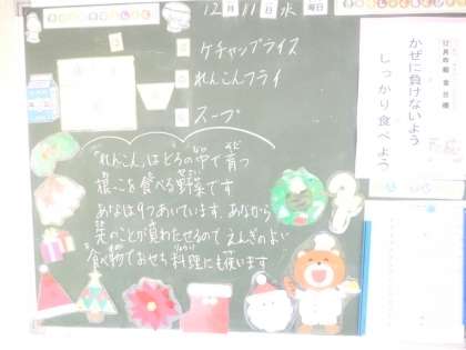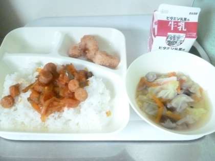 12月11日(水)の給食は、ケチャップライス。牛乳・スープ・レンコンフライです。
