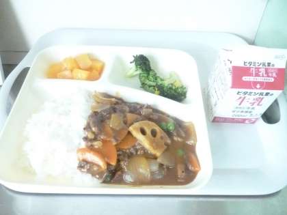 12月17日(火)の給食は、冬野菜のカレーライス・ブロッコリーとコーンのサラダ・黄桃(カット缶)です。