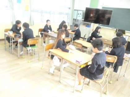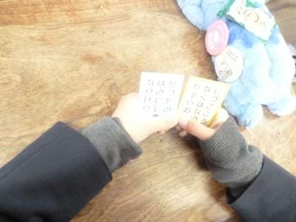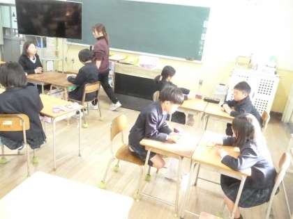 4年2組では国語科「百人一種に親しもう:を学習しています。本時では、二人一組になって実際に百人一首をしていました。まだ学習して間もないので、上の句を聞いた段階で取るのは難しいようです。一つでも多く覚えて、上の句を聞いた段階で札が取れるようにがんばってほしいです。