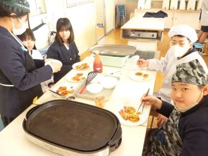 6年 ピザ作り 公開日 2025/02/27 更新日 2025/02/27 6年 6年2組では、プレゼント用の雑巾を縫って、ピザを作りました。一仕事終えて、美味しそうに食べていました。 ※私もピザをいただきましたが、給食で調理員さんが作った一口ピザに負けないくらい美味しかったです。 いいね(0)