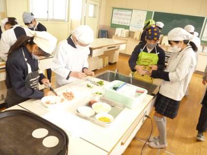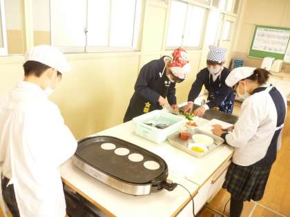 6年 ピザ作り 公開日 2025/02/28 更新日 2025/02/28 6年 6年1組では家庭科「ピザ作り:に取り組んでいました。手分けして、食材を切ったりホットプレートに餃子の皮を並べたり、手際よく進みました。それでは、餃子の皮の上に食材を並べて焼き始めます。上手に焼き上がるでしょうか。 いいね(0)