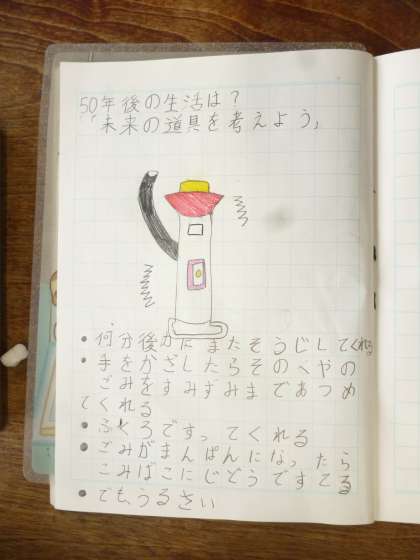 3年 50年後の道具1 公開日 2025/02/28 更新日 2025/02/28 3年 3年生ははぐくみネットの方々から昔の道具、七輪の使い方や良いところについて学びました。本時では、未来の道具について考えていました。「ロボット洗濯機」「危険があったら知らせるロボ」「自動料理機」など、便利そうな道具がいくつも考え出されていました。 いいね(0)