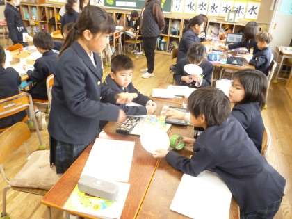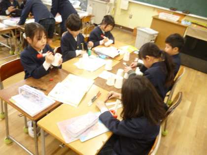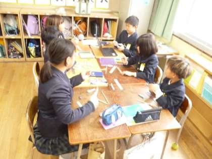 3年生は理科「おもちゃランド」に取り組んでいました。磁石・豆電球や電池・ゴムや風の力など、3年生になって理科で学んだことを活かして、楽しいおもちゃをグループで協力して作っていました。「どきどき輪くぐり」「魚つり」「コロコロうさぎ」など、完成が楽しみです。