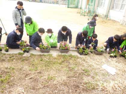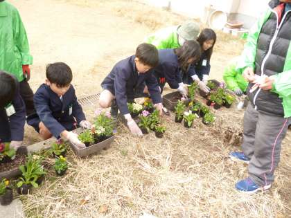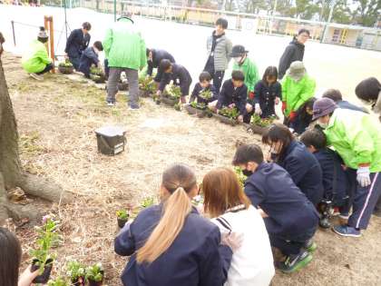 委員会活動の時間に、はぐくみネットから「GREEN CLUB大正」の方々にお越しいただき、ご指導いいただいて、運動委員会の児童による花の寄せ植えを行いました。「デージー」「ジュリアン」……、はぐくみネットの方々から植える花の名前を教えていただきました。