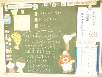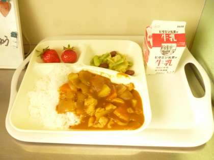 3月7日(金)の給食は、チキンカレーライス・牛乳・ビーンズサラダ・いちごです。