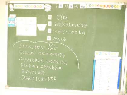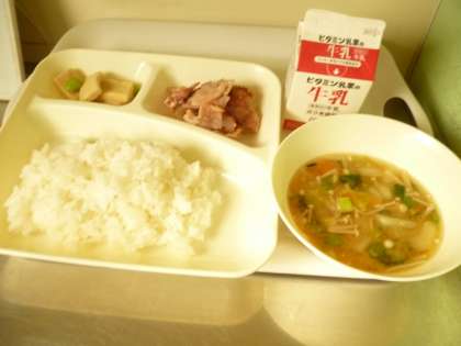 3月19日(水)の給食は、ごはん・牛乳・豚肉のしょうが焼き・みそ汁・高野豆腐の煮物です。