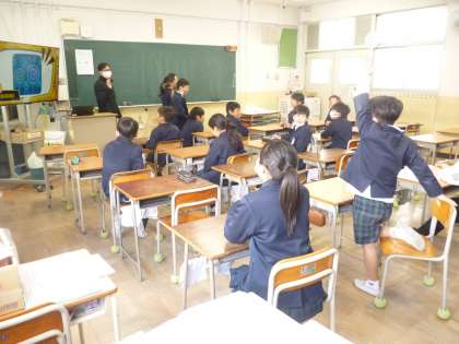 5年 Quiz 公開日 2025/03/19 更新日 2025/03/19 5年 5年2組では英語科の時間にQuizを出していました。テレビ画面に「temple」「Friday」「bicycle」などの答えが映ります。画面を見た児童が挙手して英語でのヒントを出します。そのヒントを聞いて、背を向けているグループが答えます。ヒントを出すのが案外難しいようです。 いいね(0)
