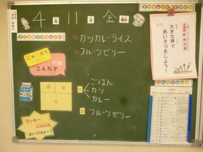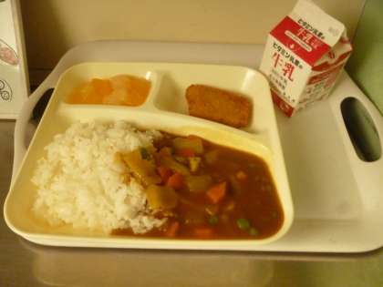 4月11日(金)の給食は、カツカレーライス・牛乳・フルーツゼリーです。入学お祝い献立になっています。