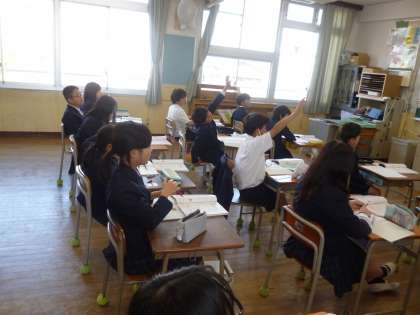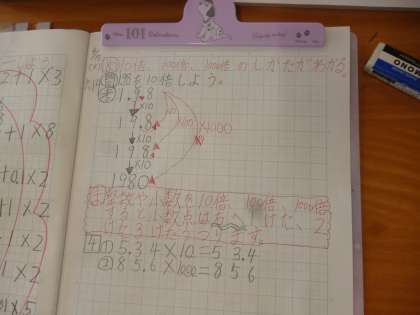5年1組では算数科「整数と小数のしくみ」を学習しています。「1.98」を10倍・100倍・1000倍すると、小数点は「0」の数だけ右へ移動する仕組みを学びました。