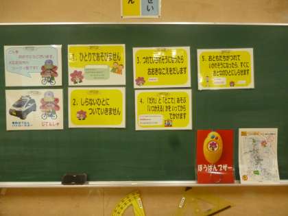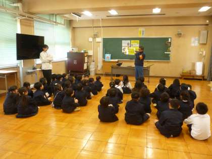 大正区役所からツージィ隊の方々にお越しいただき、1年生へ不審な人から身を守る方法について教えていただきました。「ひとりで あそばない」「しらない ひとに ついていかない」など、気をつけることを5つ教えていただきました・