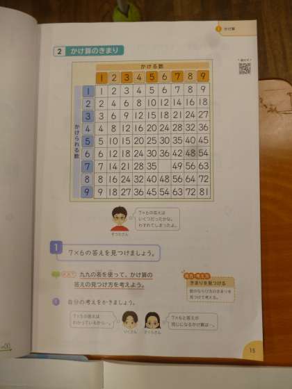 3年 九九のきまり 公開日 2025/04/17 更新日 2025/04/17 3年 3年2組では算数科「九九のきまり」について学習しています。本時では「7×6」の答えを九九の表を使って考えます。「7×6」の部分、九九も表では空白になっています。 そして、よく見るとこの九九の表にはきまりがあるようです。九九の表のきまりを発見して「7×6」の答えも見つけてほしいです。 いいね(0)
