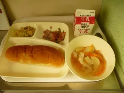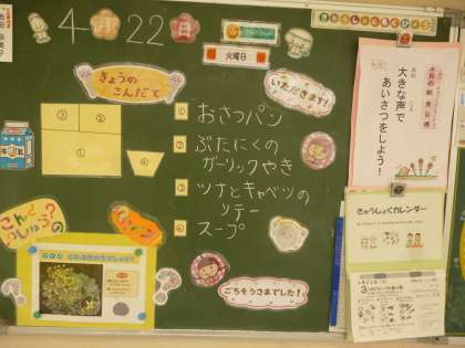 4月22日(火)の給食は、おさつパン・牛乳・豚肉のガーリック焼き・スープ・ツナとキャベツのソテーです。