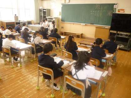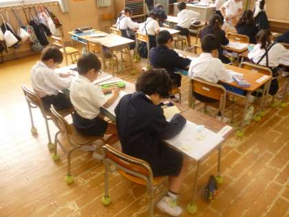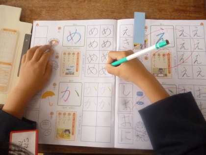 1年2組では国語科の時間に、ひらがな「め」を習っていました。2画目は、書き始めの角度や、ぐるっと回って最後に「はらう」ところが難しいようです。練習できた児童から先生の前に並んで見てもらっていました。
