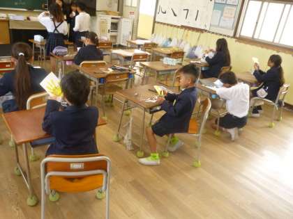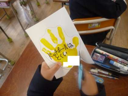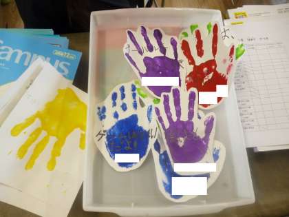 3年 お助けの木2 公開日 2025/05/01 更新日 2025/05/01 3年 「〇〇なら おまかせ」と書けたら先生にチェックしてもらい、合格したら手形を切り取ります。この後、手形を木の葉のように貼り合わせ「お助けの木」を作るようです。 自分たちが得意なことを出し合うことで、助け合える仲間を作ることがねらいです。 いいね(0)