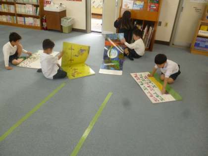 1年1組は図書の時間でした。気に入った本を選んで自分の席に座って読みますが、大型の絵本は机の上で開くと場所を取るので、床で読んでいます。