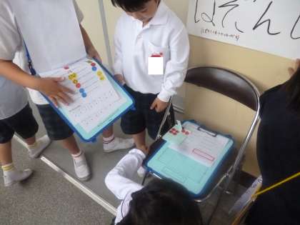 グループでは2年生が1年生に教室の紹介をしながら、学校中を案内します。教室にたどり着いたら、前に置いてあるシールを探検ボードに貼ります。
