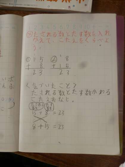2年 たされる数とたす数を入れ替えると 公開日 2025/05/09 更新日 2025/05/09 2年 2年生は算数科「たし算のしかたをかんがえよう」を学習しています。本時では、「15+8」のたされる数とたす数を入れ替えると答えはどうなるのかを確かめていました。計算すると、どちらの答えも「23」になることがわかりました。この結果から、わかったことをまとめます。 いいね(0)