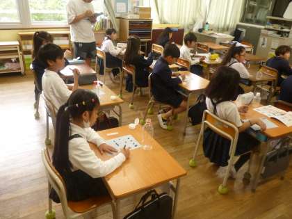 3年生になると、書写の時間に毛筆の学習が始まります。2組では、水で書いてもしばらくしたら消えるので何度も練習できる「魔法の半紙」を使って横画の練習をしました。始筆と終筆の筆運び、ひじの使い方などを学びました。硬筆とはやはり違うようです。